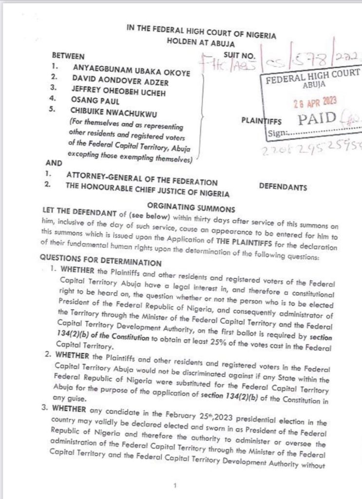 They further want a declaration that, “the plaintiffs and other FCT residents have a legal interest and constitutional rights to be heard on the question of whether a President-elect must secure at least 25% of votes cast, on the first ballot, in the FCT, Abuja.”