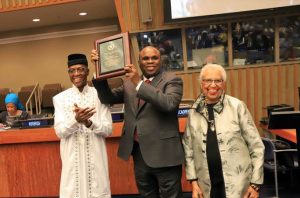 Afreximbank President Prof. Benedict Oramah displays the 2019 African Renaissance and Diaspora Network Private Sector Development Award he received at the United Nations Headquarters. With him were Dr. Djibril Diallo, CEO of ARDN (left) and Constance Newman, Chairman of ARDN.