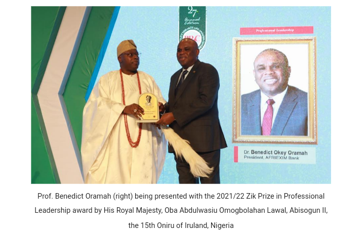 The President of the African Export-Import Bank (Afreximbank), Prof. Benedict Oramah, was in Lagos awarded the 2021/22 Zik Prize in Professional Leadership by the Public Policy Research and Analysis Centre (PPRAC).