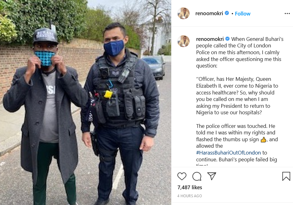 After Explaining Why I Staged The #HarassBuhariOutOfLondon Protest, I received Thumbs up From UK Cop – Reno Omokori