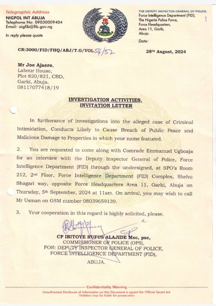 “You are requested to come along with Comrade Emmanuel Ugboaja or an interview with the Deputy Inspector General of Police, Force intelligence Department (FID) through the undersigned, at SPO’s Room 12, 2nd Floor, Force Intelligence Department (FID) Complex, Shehu hagari way, opposite Force Headquarters Area 11, Garki, Abuja on Thursday, 5th September, 2024 at 11am.