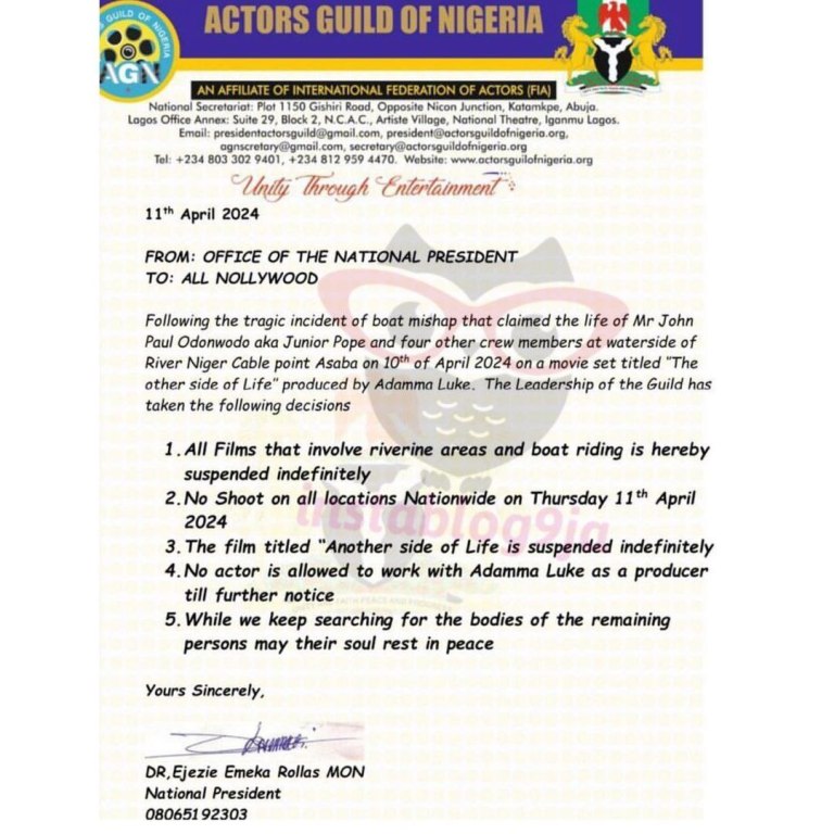 The move follows the tragic incident of boat mishap that claimed the life of Mr John Paul Odonwodo aka Junior Pope and four other crew members at the waterside of River Niger Cable point Asaba on 10 April 2024 on a movie set titled ‘The other side of Life’ produced by Adanma Luke.