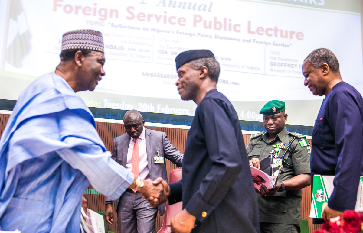 The Vice President, Yemi Osinbajo (Centre); Former Head of State, Gen. Yakubu Gowon (Left) and Minister of Foreign Affairs, Geoffrey Onyeama at the 1st Annual Foreign Service...