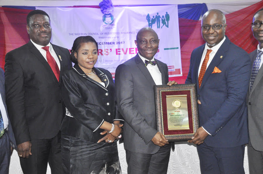 L-R: Vice-President, Nigerian Council of Registered Insurance Brokers, Mr. Rotimi Edu; Deputy President, Mrs. Bola Onigbogi, Managing Director, AIICO Insurance Plc., Mr. Edwin Igbiti; and President,...