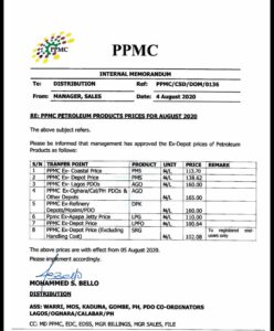 The Pipelines and Products Marketing Company, PPMC which is a subsidiary of the Nigerian National Petroleum Corporation, NNPC has approved the ex-depot price for petroleum products for the month of August.