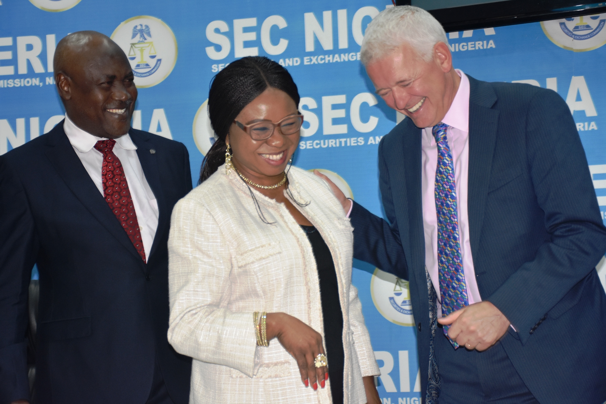 From Left; Managing Director, Nigerian Capital Markets Institute, NCMI, Ismaila Ville; Acting Director General Securities and Exchange Commission, Ms Mary Uduk and CEO, Chartered Institute for Securities and Investments, Mr. Simon Culhane at the signing of an MoU between the CISI and NCMI in Lagos on Tuesday.