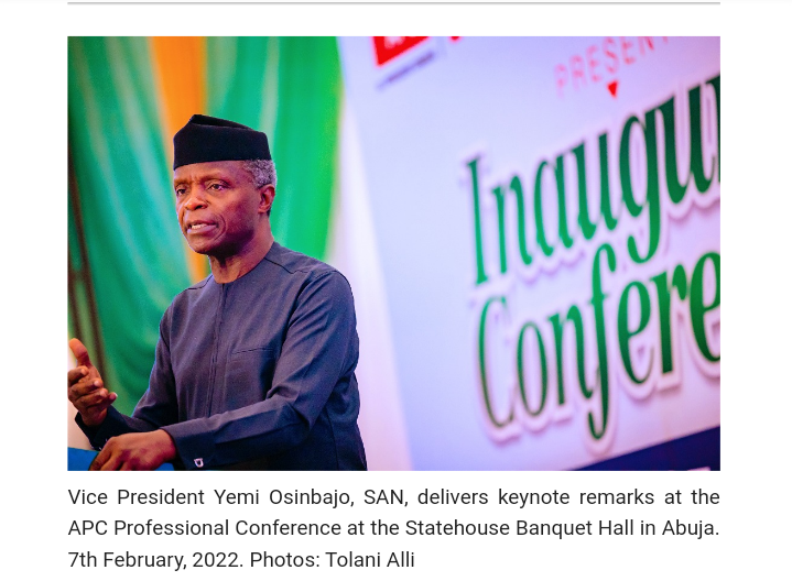 Vice President Yemi Osinbajo, SAN, delivers keynote remarks at the APC Professional Conference at the Statehouse Banquet Hall in Abuja. 7th February, 2022. Photos: Tolani Alli