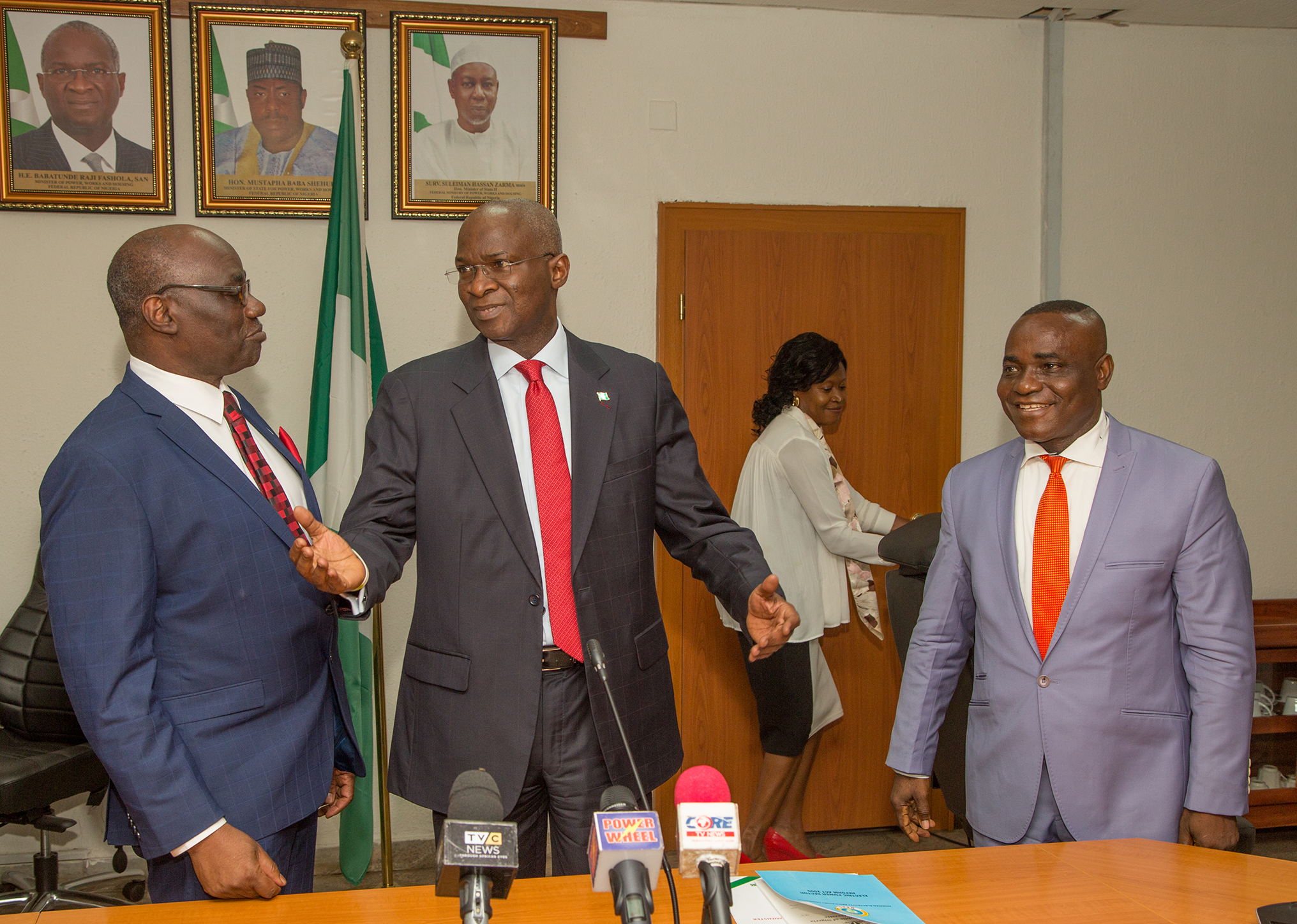 Minister of Power, Works & Housing, Mr Babatunde Fashola (middle); Senior Special Assistant to the President on National Assembly Matters, Senator Ita Enang (right) and Chairman, Nigerian Electricity Regulatory Commission (NERC), Prof. James Momoh (left), shortly after the inauguration of the Chairman of NERC at the  Ministry of Power, Works & Housing Headquarters, Abuja, on Thursday 3rd May, 2018.