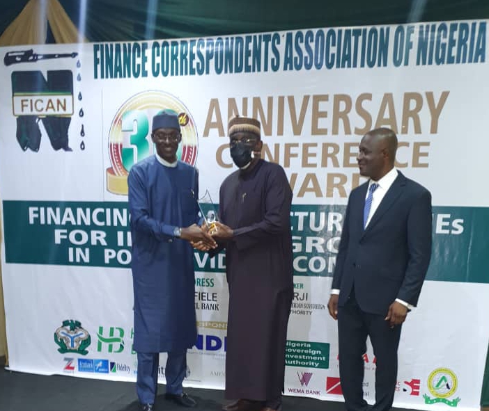 NDIC’s Director, Communication & Public Affairs, Mr Bashir Nuhu (Left) receiving Award of Special Recognition for Support to Finance Correspondents Association of Nigeria (FICAN) and Financial Journalism in Nigeria on behalf of  NDIC MD/CE, Mr. Bello Hassan, from former MD, Bank of Industry, Dr. Waheed Olagunju while FICAN President, Chima Nwokoji watches in admiration today in Lagos.