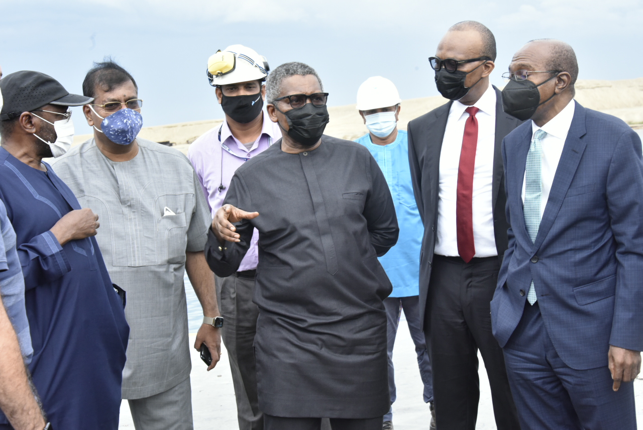 L- R: Senator Sabo Mohammed, Group Executive Director, Strategy, Capital Projects & Portfolio Development, Dangote Industries Limited, Devakumar Edwin, President of Dangote Industries Limited, Aliko Dangote, Managing Director of UBA plc, Kennedy Uzoka, Central Bank Governor, Godwin Emefiele. During the Central Bank Governor with Banks M.D. Visit Dangote Petroleum Refinery, Petrochemical Complex, Fertilizer Plant & Subsea Gas Pipeline Projects, Lekki Lagos on Friday 4th June 2021