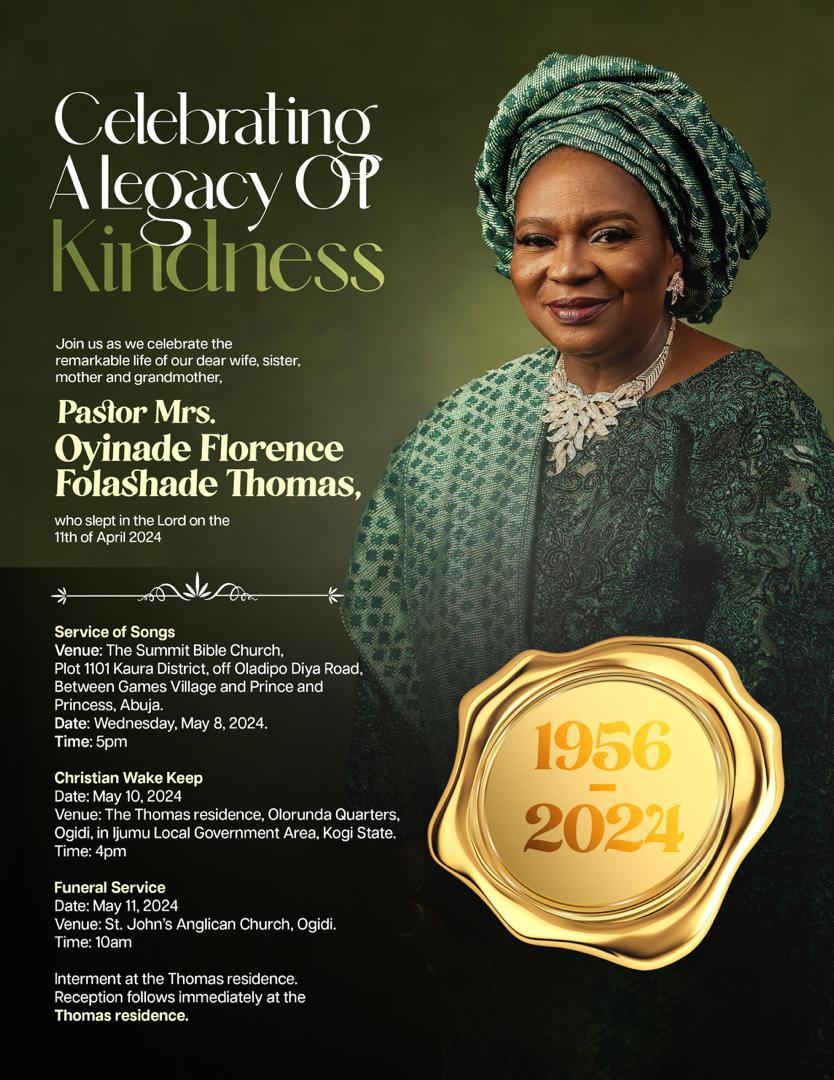 The family of the Commissioner for Insurance / CEO NAICOM, Sunday Thomas has unfold funeral arrangements for his deceased wife, Pastor Mrs. Oyinade Thomas.