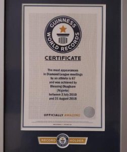 Nigerian athlete Blessing Okagbare has been recognised by the Guinness Book of World Records as the only athlete to have attended the Athletics Diamond Meetings 67 times.