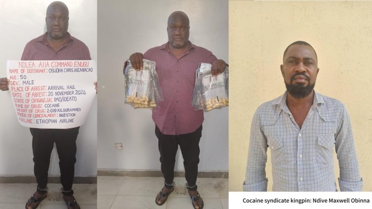 Operatives of the National Drug Law Enforcement Agency (NDLEA) have arrested a 50-year-old businessman, Osuoha Christian Iheanacho, at the Akanu Ibiam International Airport, AIIA, Enugu, for ingesting 90 wraps of cocaine.