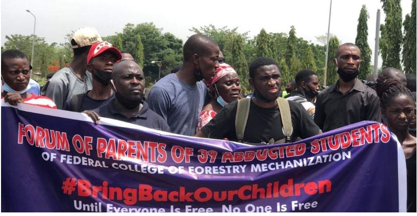 Protesting Parents of the kidnapped students of the College of Forestry Mechanisation Afaka in Kaduna State on Tuesday stormed the National Assembly complex Abuja, demanding intervention for the release of their abducted children.