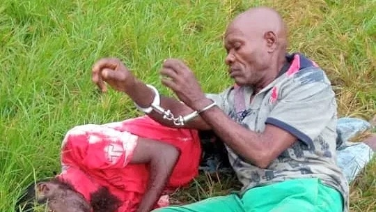 He was about to escape with the body parts before he was caught in the bush by other security men. He was handcuffed by the police and his photograph taken as he sat beside the corpse on the open field where the corpse was deposited.”