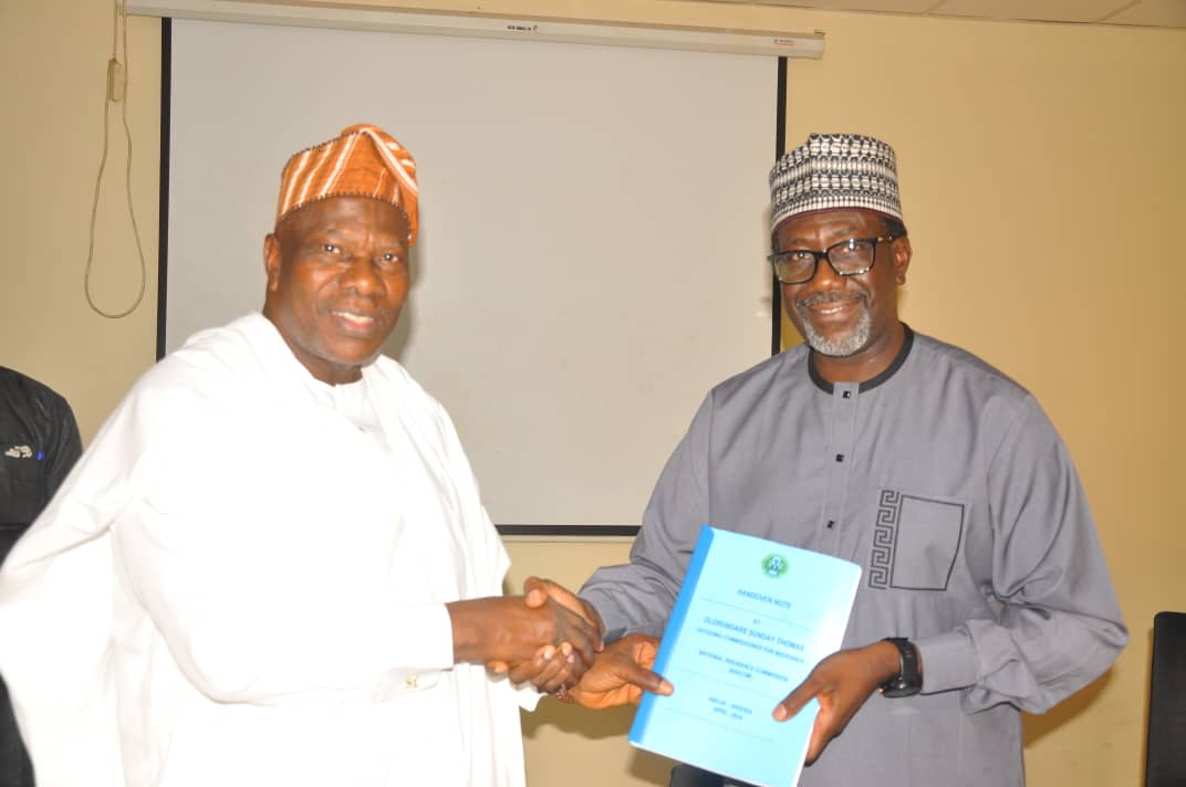 Mr. Olusegun Ayo Omosehin (Right) taking over from his predecessor, Mr. Sunday O. Thomas, as the Commissioner for Insurance/CEO, National Insurance Commission (NAICOM) on Friday 3rd May, 2024 at the NAICOM's Corporate Headquarters, Abuja