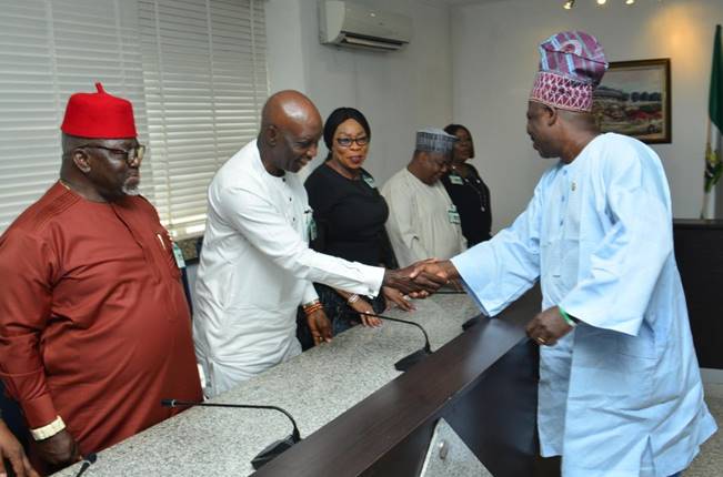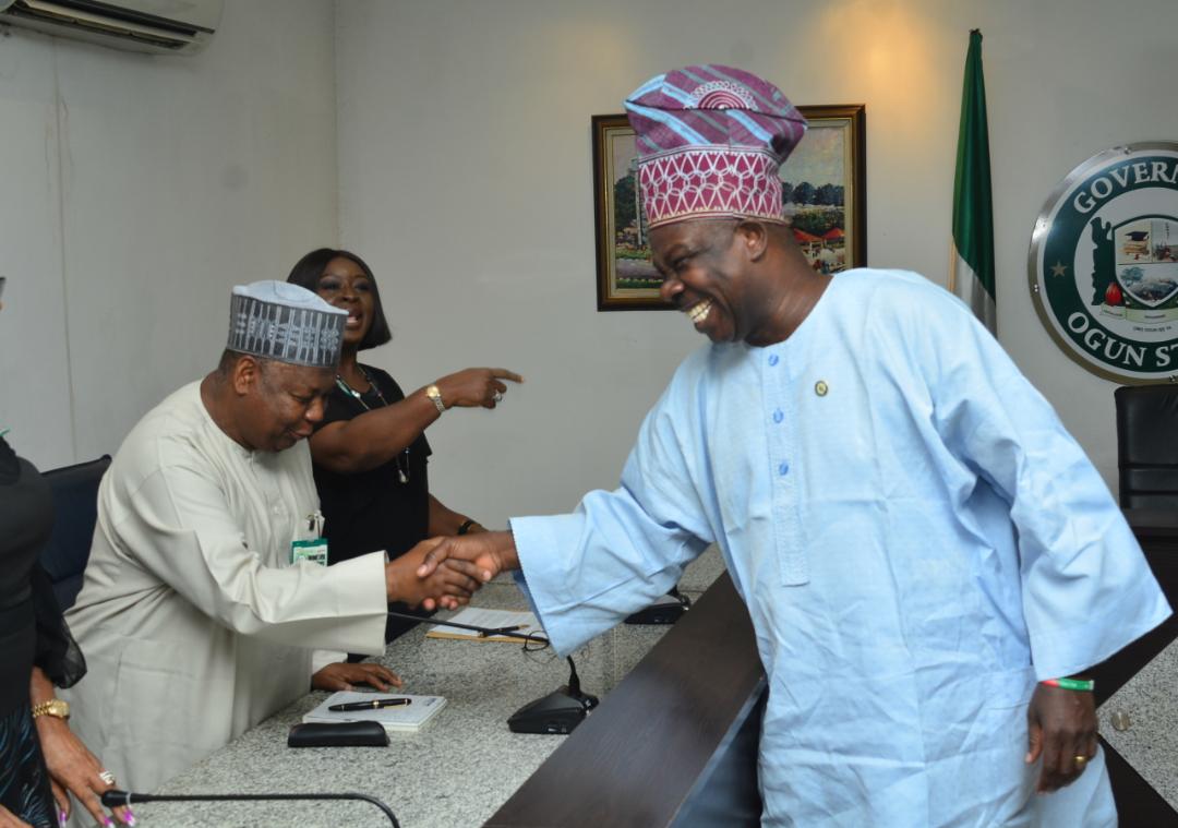 The Managing Director of the Nigeria Deposit Insurance Corporation (NDIC), Umaru Ibrahim (left), exchanges pleasantries with the Ogun State Governor, Ibikunle Amosun (right), during the NDIC Board’s visit to the Governor led by the NDIC Board Chairman, Ronke Sokefun (centre).