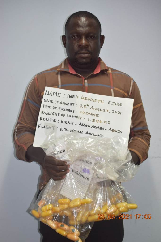 The 41-year-old suspect who was arrested on Wednesday, 25th August, 2021, upon his arrival on board an Ethiopian Airline flight 911 from Kigali via Addis Ababa was taken in for secondary check during which he tested positive to ingestion of illicit substance. While under observation, he excreted 87 pellets of cocaine weighing 1.884 kilograms. Ibeh who imports cloths for sale hails from Owerrizikeala village in Orumba Local Government Area of Anambra state.