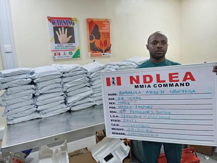 In Kogi state, a suspect, Charles Chike, 45, was arrested by NDLEA operatives in a hotel in Lokoja on Friday 16th Feb. with 290 blocks of compressed cannabis weighing 116kg. The exhibit was concealed in the boot of a blue Honda Accord car marked Abuja ABC 853 SL, which took off from Ekiti state enroute Abuja. Not less than 227kg of same substance was recovered from Atoshi camp, Emure -Ile, Owo LGA, Ondo State, while two suspects: John Jonathan and Emmanuel Alex were arrested.