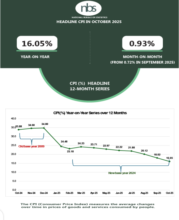 NBS report states: “In October 2025, the Headline inflation rate eased to 16.05% relative to the September 2025 headline inflation rate of 18.02%. Looking at the movement, the October 2025 Headline inflation rate showed a decrease of 1.96% compared to the September 2025 Headline inflation rate.