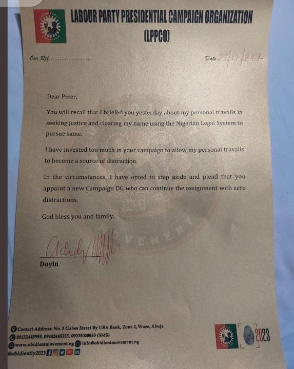 On Tuesday, in a letter to the Presidential Candidate of the Labour Party, Peter Obi, Dr Okupe noted that he has invested too much in the campaign to allow his personal travails to become a source of distraction.