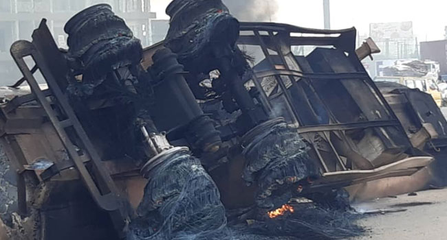 The tanker’s head reportedly fell off and went up in flames after spilling its content within the area.