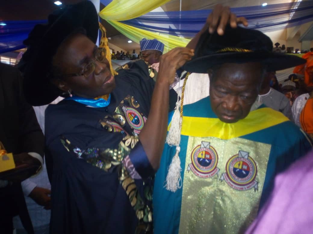 The Provost, AOCOED, Mrs. O.A Ladele decorating the first Civilian Executive Governor of Lagos state, His Excellency, Pa Alhaji Lateef Kayode Jakande, with Fellowship Award.