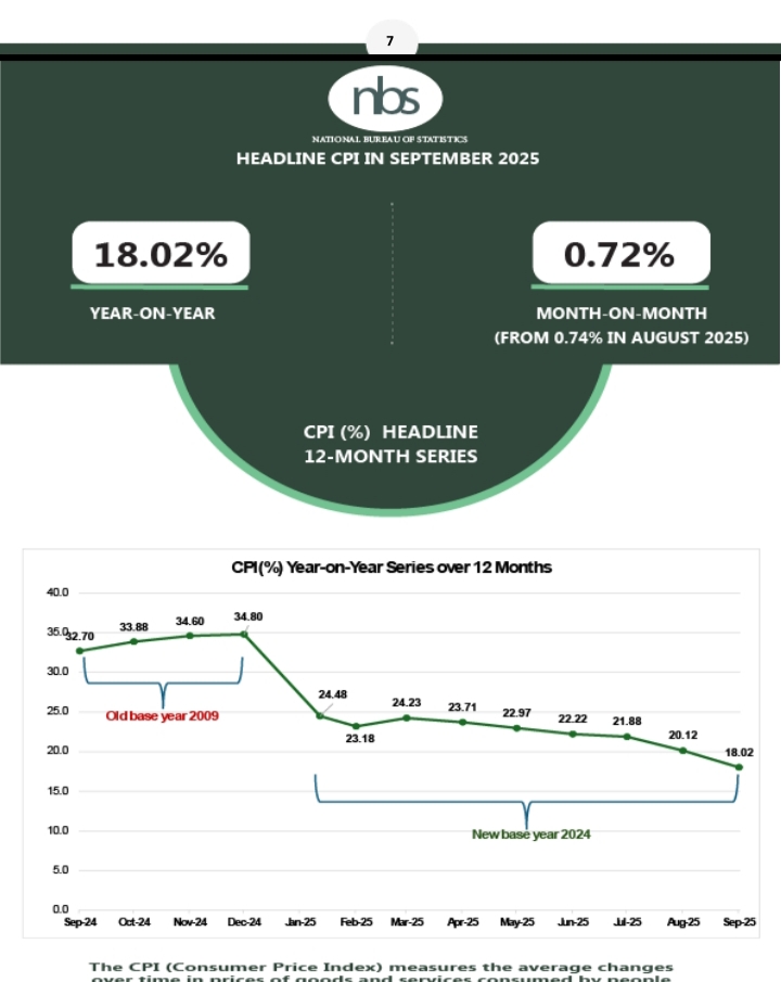 Statistics from the National Bureau of Statistics (NBS) on Wednesday, showed a decrease in inflationary trends from 20.12 percent recorded in the previous month of August to 18.02 percent in September 2025.