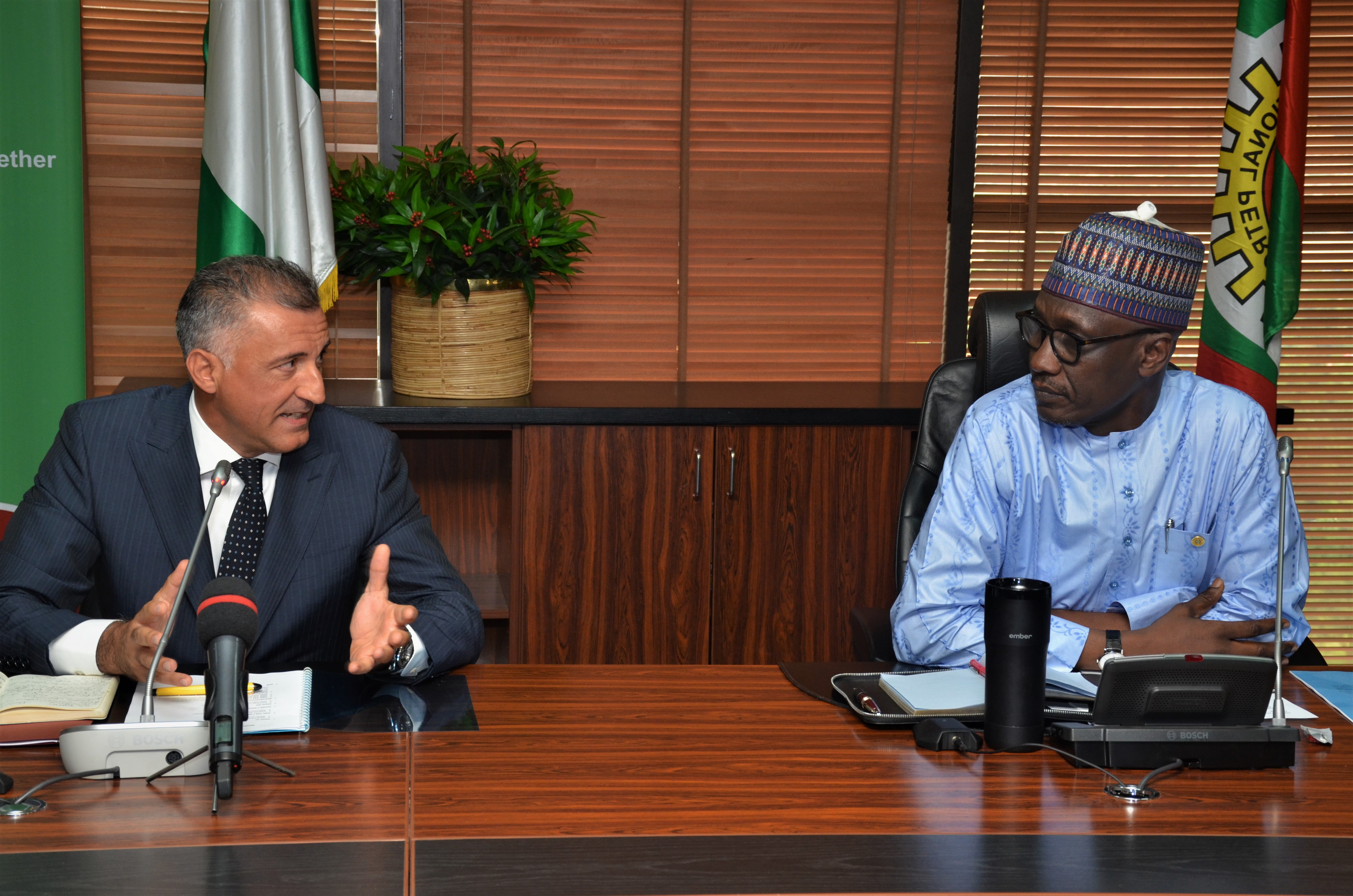 Executive Vice Chairman, Sub-Saharan African Region and Chairman ENI Exploration and Production in Nigeria, Mr. Brusco Guido, briefing the NNPC GMD, Mallam Mele Kyari, on some of the challenges being faced by the NNPC/NAOC Joint Venture operations during a visit to the NNPC Towers yesterday.