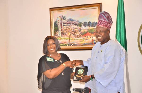 The Chairman Board of Directors of the Nigeria Deposit Insurance Corporation (NDIC), Ronke Sokefun, receives a plaque from the Ogun State Governor, Ibikunle Amosun during the...