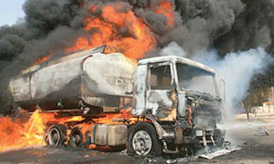 NAN reports that a tanker conveying 45,000 litres of Premium Motor Spirit (PMS) had on May 25 crashed and exploded at Banire/Ejigbadero Bus Stop, in Egbeda area of Lagos State. (NAN)