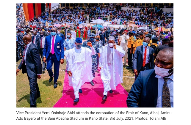 The Vice President, who conveyed the President’s warm felicitations and personal good wishes to the State government and people of Kano, described the coronation as ‘historic’, while noting that Kano is revered as a major commercial and economic centre in sub-Saharan Africa.